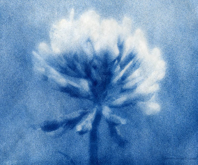 cyanotype: a photographic process which produces a cyan blue image. The cyanotype was an inexpensive and easy way to reproduce work efficiently. The process was used in the 20th century by engineers for this reason. A negative image is produced by the process. Sir John Herschel invented the cyanotype process in 1842. He envisioned the cyanotype to be used for reproducing notes and diagrams. This was how the process was used until Anna Atkins began creating cyanotypes for aesthetic reasons. She documented botanical subjects and made many books. Anna Atkins is considered to be one of the first female photographers for this reason.